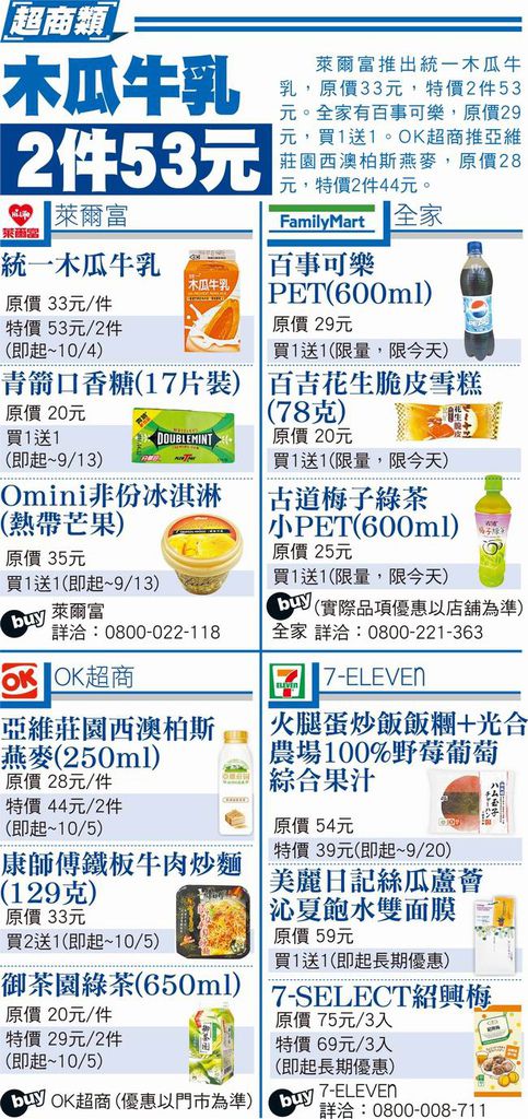 【7-11、全家、萊爾富、OK】9/9 買一送一..等